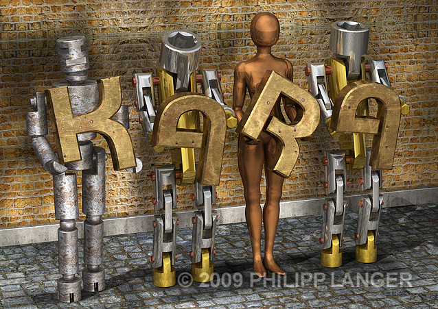 Androide Roboter, Lettern tragend / Android Robots Holding Massive Golden Letters. 3D-Modeling, Philipp Langer, 2009. Für Kara zum 14. Geburtstag